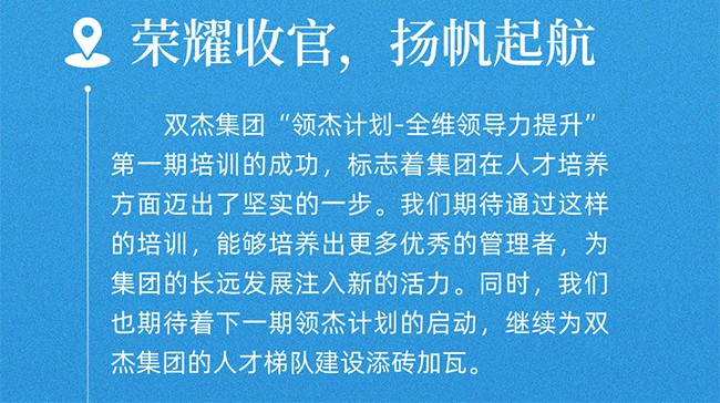 領(lǐng)杰計(jì)劃-全維領(lǐng)導(dǎo)力提升培訓(xùn)項(xiàng)目第一期圓滿(mǎn)收官! 5073 字號(hào) 返回列表 上一篇 2024.09.20 教師節(jié)專(zhuān)刊 下一篇 雙杰集團(tuán)育杰計(jì)劃